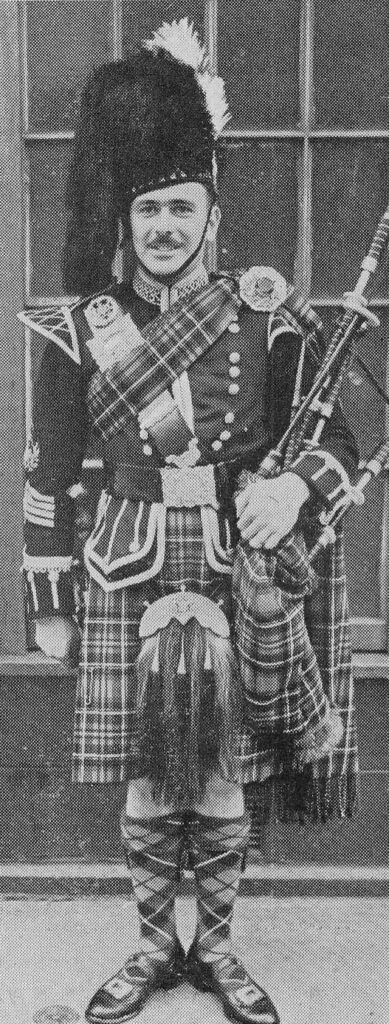 •Pipe Major William Grant was born in 1888. He joined the 2nd Battalion Scots Guards in 1908. He was wounded during the first Battle of Ypres in 1914. He lost an eye and carried pieces of unrecovered ammunition in his body for the rest of his life. After recovery from his wounds, he served the Royal Household in Windsor, before returning north, eventually settling in Strathdon in 1930. Grant was employed on the Candacraig estate and soon became Pipe Major of the Lonach Pipe Band. He was a well respected teacher. He died in 1963.