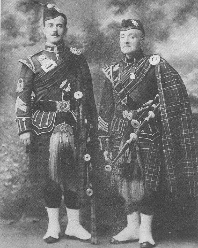 In 1895 John Stewart became the Pipe Major of the Dundee Volunteers after the death of Donald Bain. He was appointed PM of the Battalion and was awarded the Volunteer long service medal in 1902. He died on 25th October 1913. He was unmarried and his occupation was iron moulder. A report of his funeral was published in the Dundee Courier on 30th October; ‘Well-Known Dundee Piper Laid to Rest—Impressive scenes were witnessed at the funeral at Dundee yesterday of Mr John Stewart, late pipe-major, V.B.R.H. The funeral was largely attended, a detachment of Territorials being present. On the way to the cemetery Pipers Key and Stewart played The Flowers of the Forest, and at the graveside Major McLennan, a nephew of the deceased, gave a rendering of the pathetic Lochaber No More. Deceased was a well known local piper, and had also taught many who have achieved fame in that line.’