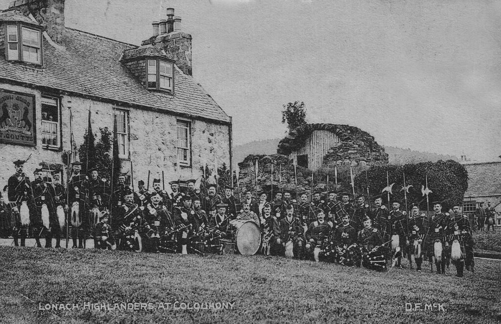 The Lonach Highland and Friendly Society was founded in 1823 by Sir Charles Forbes of Newe and Edinglassie 1st Baronet (1773-1849), with a commitment to the preservation of Highland garb and the promotion of social and friendly feelings among the inhabitants of the district. The current patron is Sir James Forbes, 8th Baronet. Lonach is noted for the march of the Lonach Highlanders. This would start early in the morning and go round the district, pausing at various places where refreshments would be provided. The date of the first gathering is unclear. The 1935 Gathering was reported as the centenary and the 2023 Gathering as the 180th.