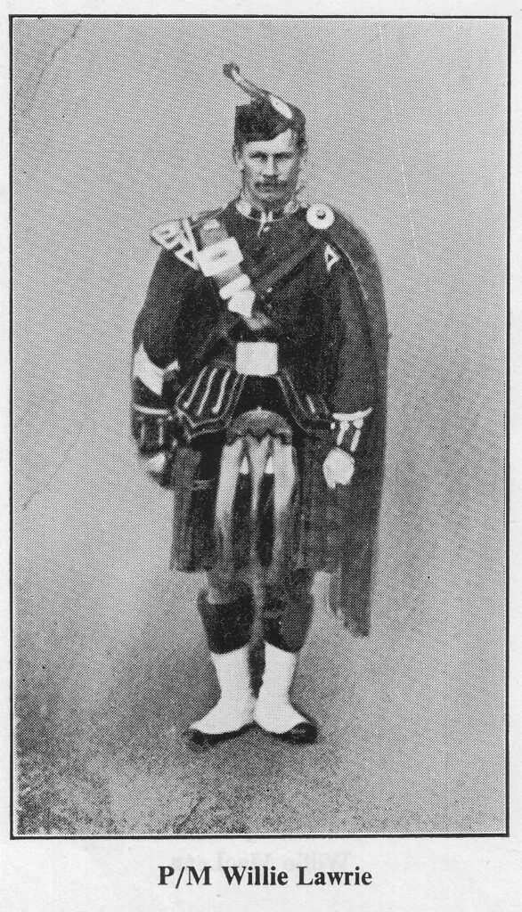 •William Lawrie, was born at West Laroch, Ballachulish in May 1881. Willie had his first piping lessons from his father before joining the 8th Argylls TA in order to improve his playing. Willie worked in the slate quarry at Ballachulish and in later years his widow told of Willie coming home with tunes written on pieces of slate. Willie would visit John MacColl at Kilbowie Cottage for further tuition and after John moved to Glasgow he would visit him there. In 1910 Willie won the Gold Medals at both the Argyllshire Gathering and the Northern Meeting and followed this with a Clasp at the Northern Meeting in 1911. When the war came in 1914 Willie went to France as Pipe Major of the Argyll and Sutherland Highlanders but his health failed in 1916 and he was invalided back to a hospital in Oxford where he died in November of that year at the age of 35.